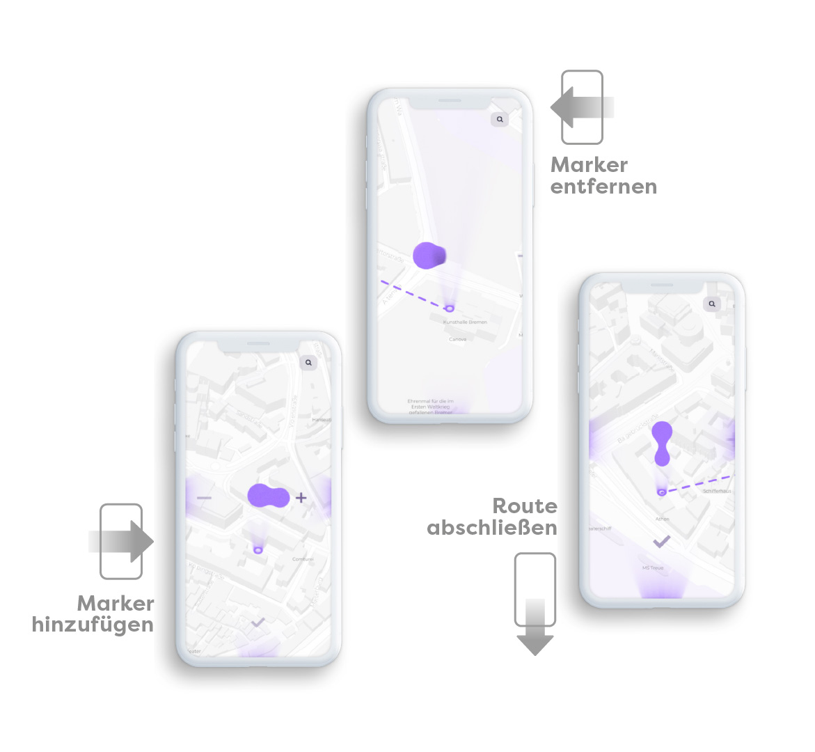 Neben der Statusanzeige ist der Marker auch das Werkzeug, um mit der digitalen Karte zu interagieren. Dazu kann der Marker berührt und gezogen werden. Sobald ein Ort durch Tippen eingelockt wird, kann der Marker in drei verschiedene Richtungen gezogen werden, um Aktionen auszulösen. Damit kann die Interaktion besonders schnell gelernt und verstanden werden.